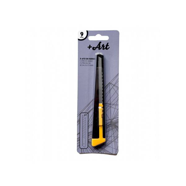 X-ato de ferro +Art com lâmina de 9mm, compacto com cabo metálico. Recomendado para cortar fitas adesivas, embalagens, cartolinas, k-line, entre muitos outros. Compatível com as lâminas de 9mm.