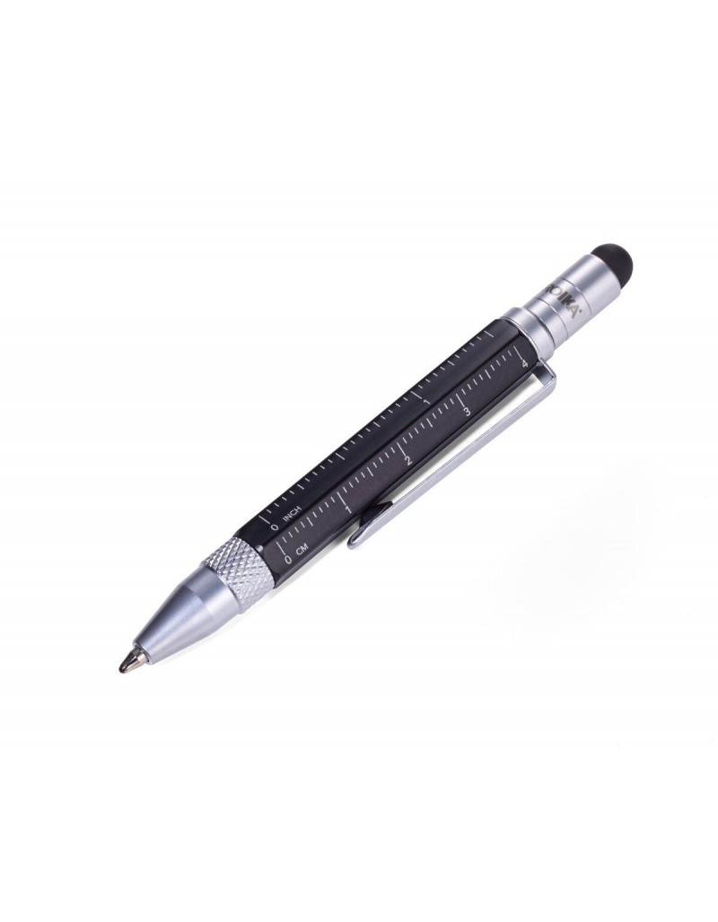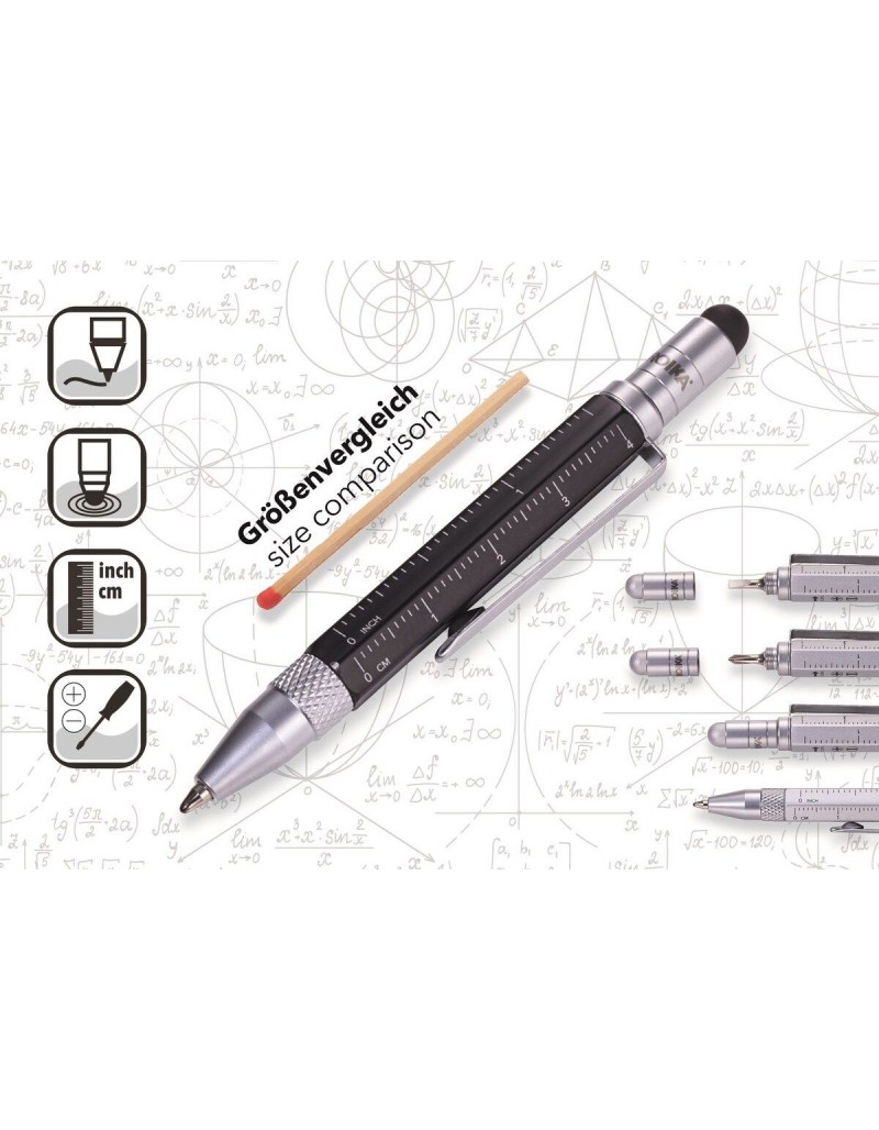 Caneta esferográfica multitarefa, régua (cm), chave de fenda phillips / cabeça chata, medidor de profundidade de pneu, chave de fenda hexagonal (1,5 mm), nível de bolha, estilete, refil preto, latão, impresso, preto / prata
