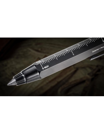Esferográfica multitarefa com régua em centímetros e polegadas, chave de fenda Phillips e uma caneta de latão com recarga. Acabamento especial Prata.