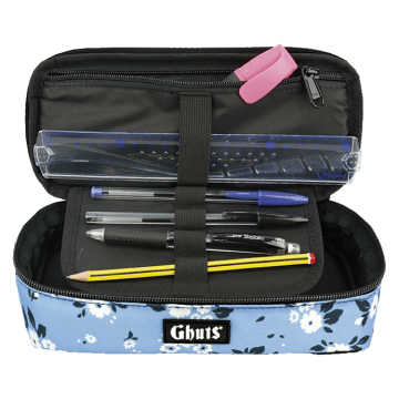 Este estojo tem três compartimentos, é um acessório completo que oferece muito espaço para guardar canetas e lápis. O seu fechamento permite transporta-lo facilmente de um lado, para outro.