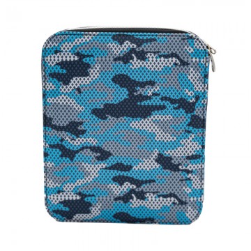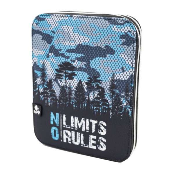 O estojo conteudo duplo No Limits by BUSQUETS apresenta um padrão de camuflagem em tons de azul, preto e cinzento. A parte frontal mostra uma silhueta de floresta com o texto “NO LIMITS NO RULES” em letras grandes e com efeito desgastado.