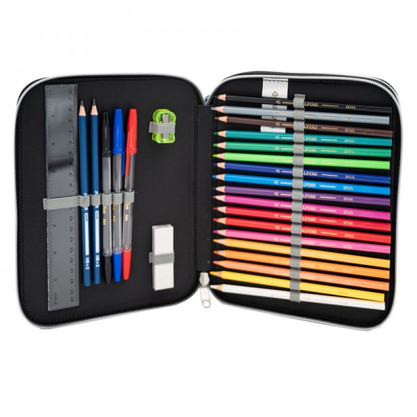 O estojo conteudo duplo tem dois compartimentos com fecho de correr. Contém: 18 marcadores de cores, 18 lápis de cores, 12 lápis de cor, régua de 21 cm, tesoura, borracha, apontador, 2 lápis HB e canetas azuis, vermelhas e pretas. Material: poliéster. Desenho aplicado sobre tecido estampado com serigrafia em várias cores.
