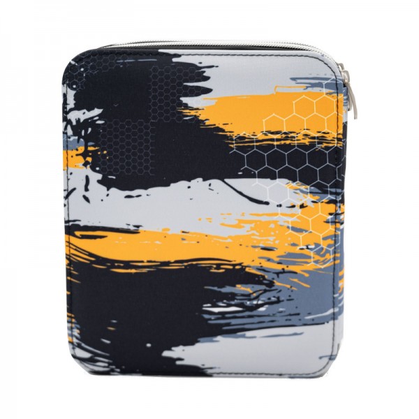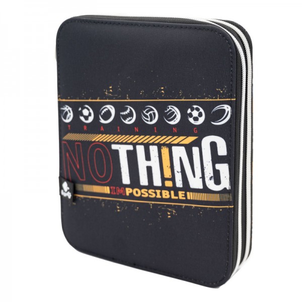 O estojo conteudo duplo Training by BUSQUETS apresenta um design dinâmico em tons de amarelo, preto, branco e cinzento, com um padrão abstrato e elementos desportivos. Na parte frontal destaca-se a frase “NOTHING is IMPOSSIBLE” em letras grandes, acompanhada de ícones de desportos como futebol, basquetebol e voleibol.