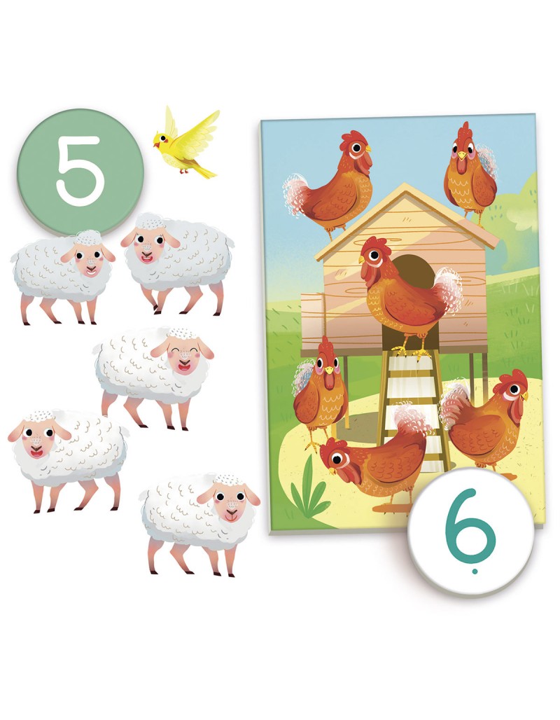 Com 3 modos de jogo, estimula as capacidades de observação e associação das crianças e ensina-lhes os primeiros conceitos de conjuntos e matemática. No segundo e terceiro modos, joga-se com as quantidades e os números. A criança conta os animais numa carta e combina-a com o respetivo número de fichas ou com a ficha com o número correspondente. O verso de cada carta com os animais mostra o número e a quantidade correspondente, para que a criança possa aprender sozinha a correspondência exata ao jogar.