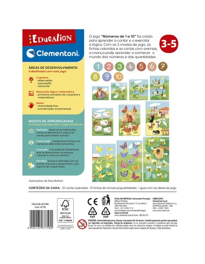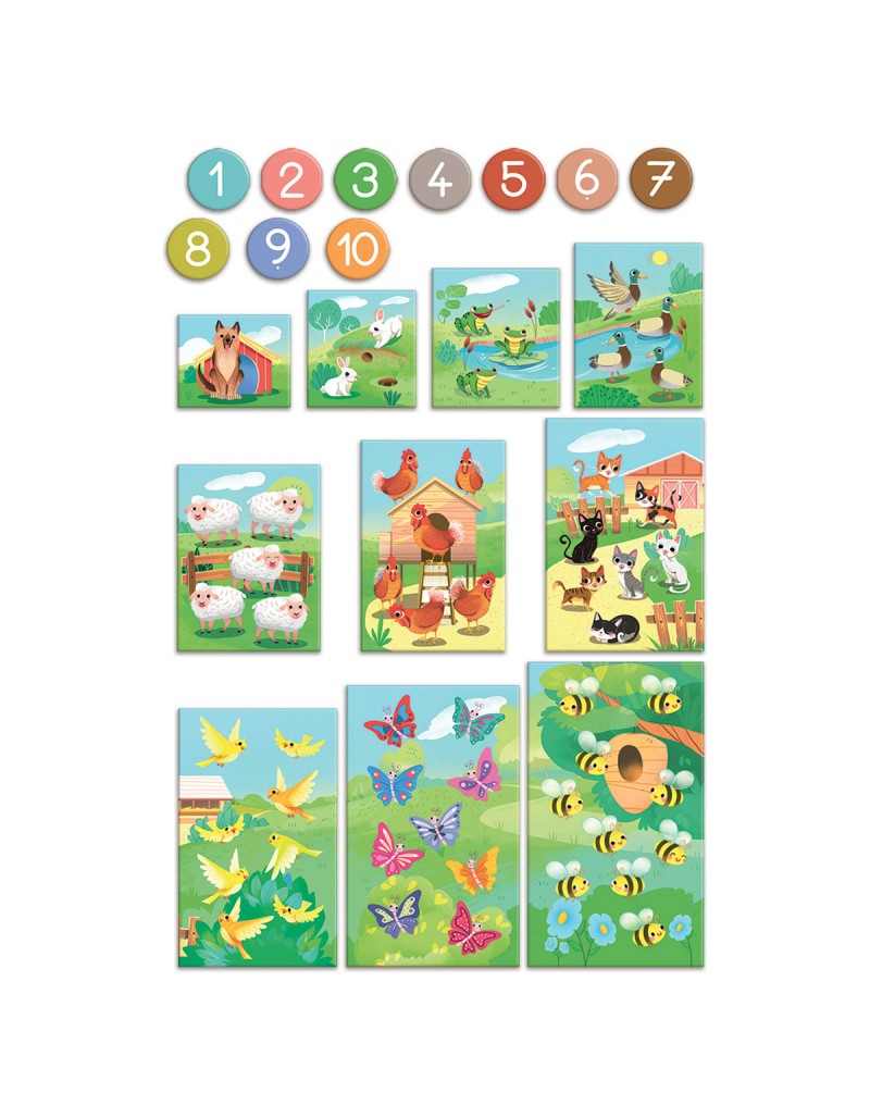 Um jogo educativo com muitas cartas ilustradas com simpáticos animais para descobrir e aprender a contar de forma fácil e intuitiva. Contém 10 fichas com números e 10 cartas de dupla face: de um lado são representados de 1 a 10 animais nas suas "casas/ambiente" e do outro o número e quantidades correspondentes.
