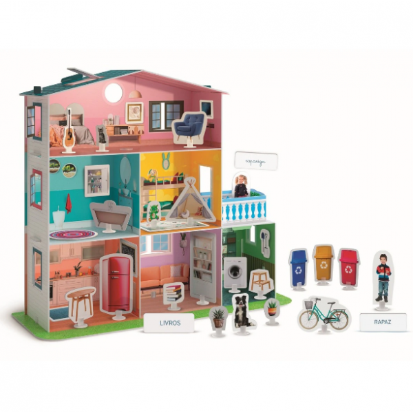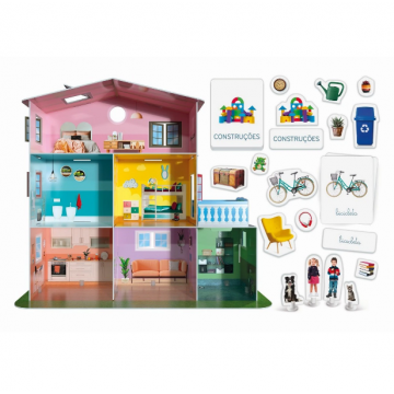 Uma fantástica casinha 3D para montar, com cinco cômodos vazios, um jardim e uma garagem, pronta para ser preenchida com objetos com muitos nomes para aprender! A criança irá divertir-se a personalizar as divisões com elementos de cartão a serem fixados às paredes com velcro e objetos fotográficos com pedestal, inventando histórias. Esta casinha dá espaço à imaginação e ajuda a desenvolver o vocabulário de forma espontânea e natural.