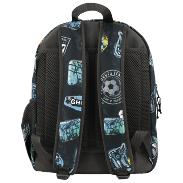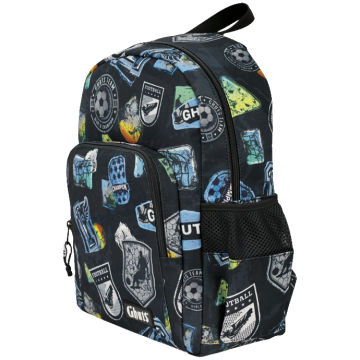 Mochila preparada para adaptar um carro escolar e o bolso lateral tem uma rede perfeita para levar uma garrafa de água.