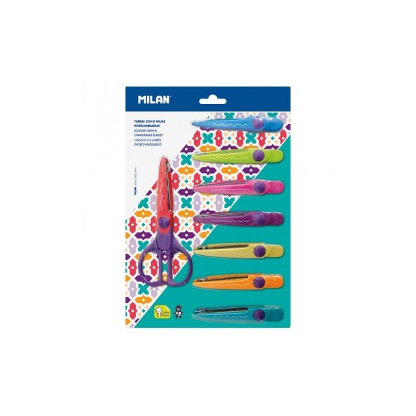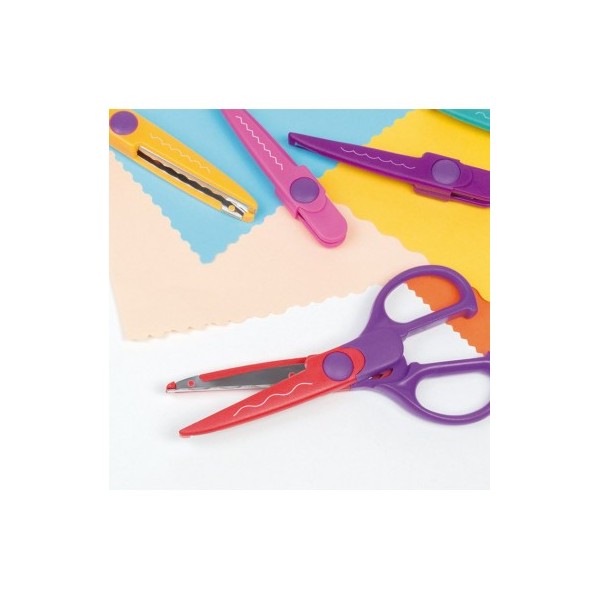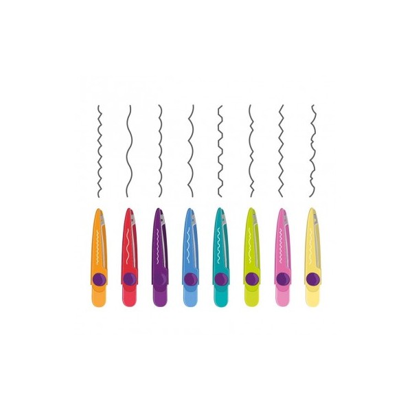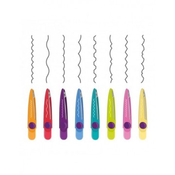 1 cabo de plástico roxo com 8 lâminas intercambiáveis de diferentes cortes. Cada lâmina é revestida de plástico e possui um desenho indicando o tipo de corte. Recomendado para artesanato e scrapbooking.